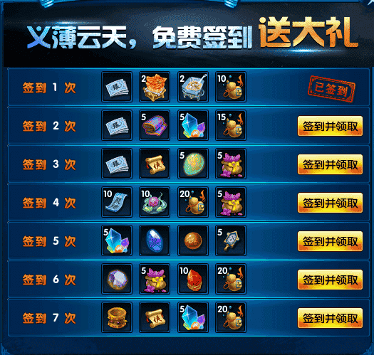 玩家可每日登陆游戏进行签到任务,领取对应天数奖励道具。